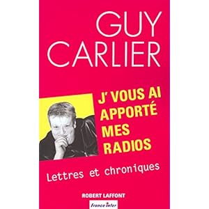 - - J'vous ai apporté mes radios : Lettres et ....Lettre à la Noiraude; lettre à un motard borgne; lettre d'un jeune madeliniste, à Arlette, à Jean-Marie Le Pen, à Jacques Vendroux, à Papon, ou encore à tous les petits et grands personnages ou événements de l'année en sont les ajoutant dans ce livre ses chroniques pour France Musique, Guy Carlier nous prouve qu'il est une véritable plume, un écrivain qui se révèle aussi tendre et sentimental qu'il peut être irrévérencieux et cruel.